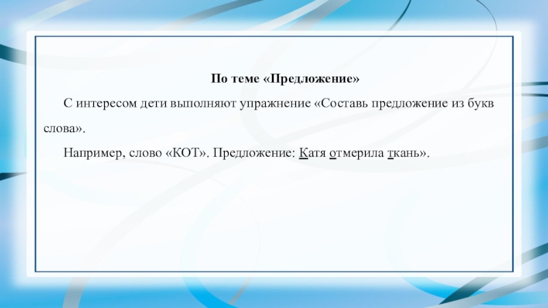 Например, слово «КОТ». Предложение: Катя отмерила ткань».