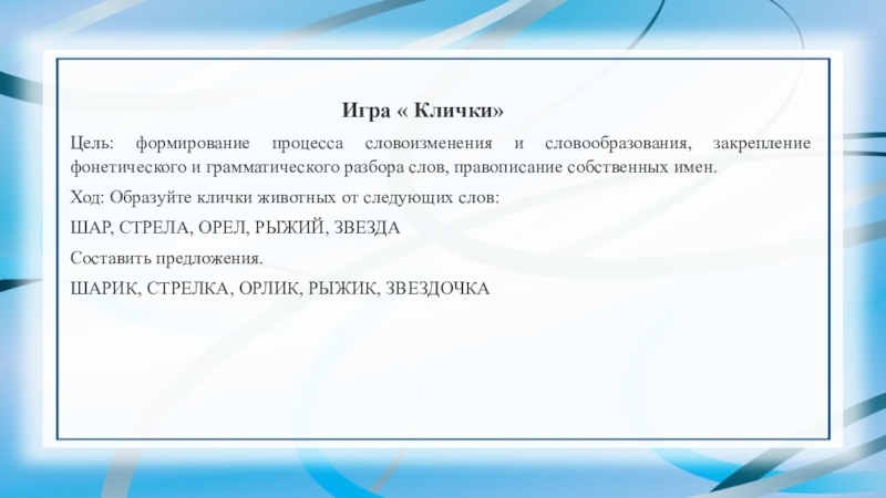 Ход: Образуйте клички животных от следующих слов: