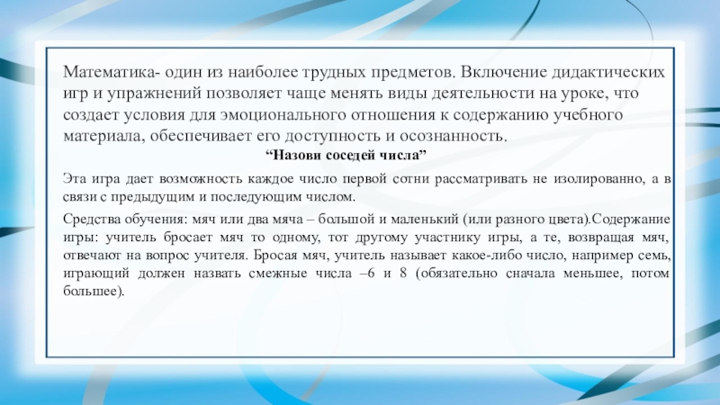 Средства обучения: мяч или два мяча – большой и маленький (или разного цвета).Содержание игры: учитель бросает мяч то одному, тот другому участнику игры, а те, возвращая мяч, отвечают на вопрос учителя. Бросая мяч, учитель называет какое-либо число, например семь, играющий должен назвать смежные числа –6 и 8 (обязательно сначала меньшее, потом большее).