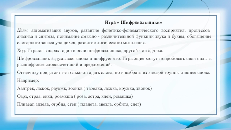 Цель: автоматизация звуков, развитие фонетико-фонематического восприятия, процессов анализа и синтеза, понимание смысло - различительной функции звука и буквы, обогащение словарного запаса учащихся, развитие логического мышления.