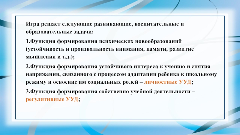 Слайд 6Игра решает следующие развивающие, воспитательные и образовательные задачи: