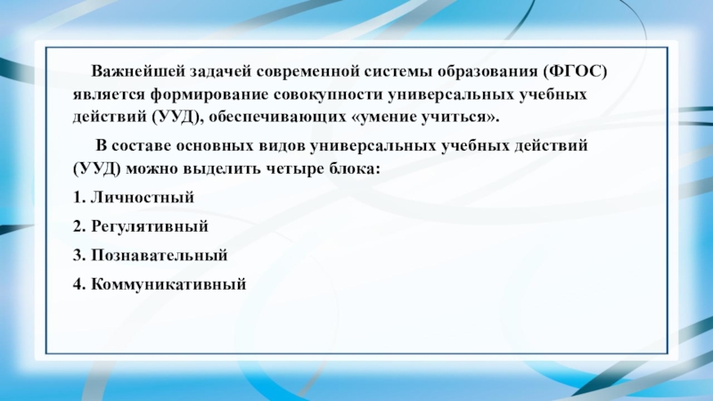В составе основных видов универсальных учебных действий (УУД) можно выделить четыре блока: