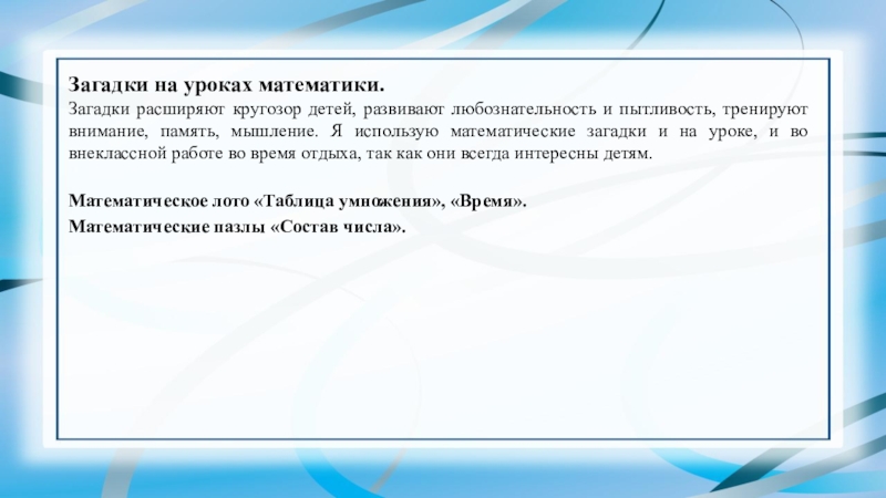 тренируют внимание, память, мышление. Я использую математические загадки и на уроке, и во внеклассной работе во время отдыха, так как они всегда интересны детям.