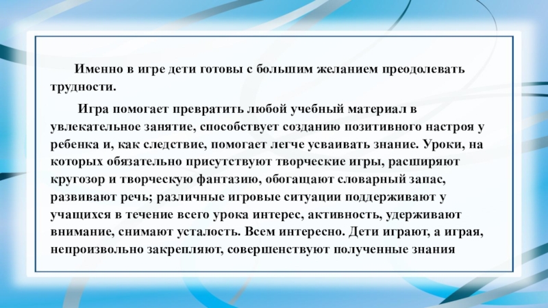 Игра помогает превратить любой учебный материал в увлекательное занятие, способствует созданию позитивного настроя у ребенка и, как следствие, помогает легче усваивать знание. Уроки, на которых обязательно присутствуют творческие игры, расширяют кругозор и творческую фантазию, обогащают словарный запас, развивают речь; различные игровые ситуации поддерживают у учащихся в течение всего урока интерес, активность, удерживают внимание, снимают усталость. Всем интересно. Дети играют, а играя, непроизвольно закрепляют, совершенствуют полученные знания