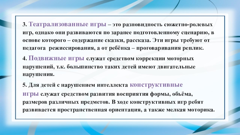 4. Подвижные игры служат средством коррекции моторных нарушений, т.к. большинство таких детей имеют двигательные нарушения.