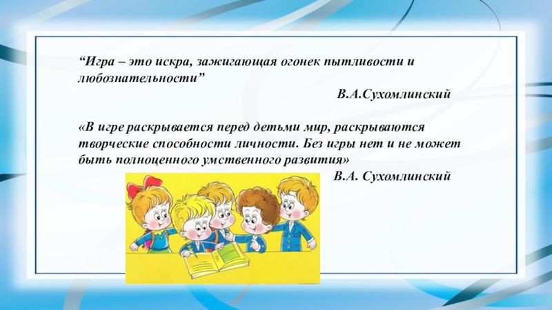Слайд 2“Игра – это искра, зажигающая огонек пытливости и любознательности”