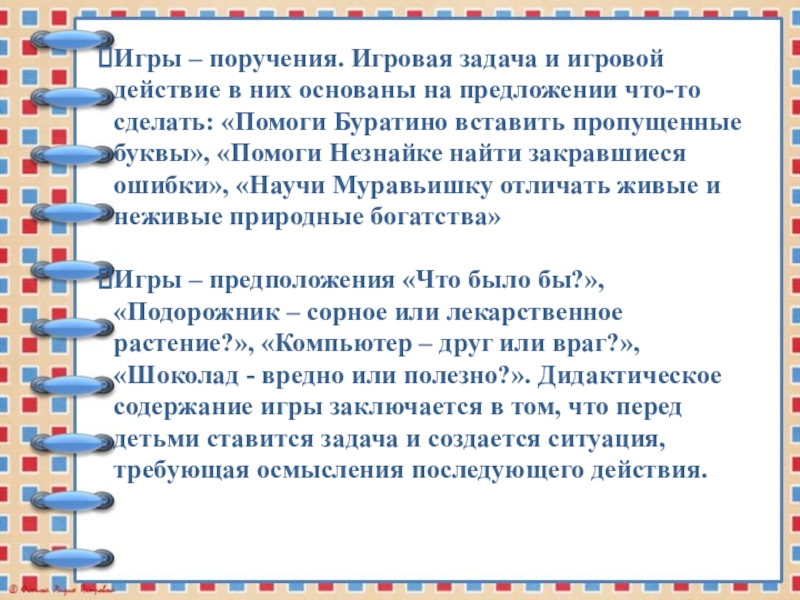 Игры – предположения «Что было бы?», «Подорожник – сорное или лекарственное растение?», «Компьютер – друг или враг?», «Шоколад - вредно или полезно?». Дидактическое содержание игры заключается в том, что перед детьми ставится задача и создается ситуация, требующая осмысления последующего действия.