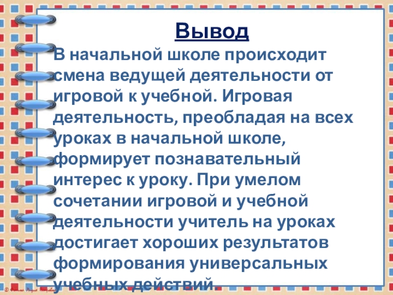 Игровая деятельность, преобладая на всех уроках в начальной школе, формирует познавательный интерес к уроку. При умелом сочетании игровой и учебной деятельности учитель на уроках достигает хороших результатов формирования универсальных учебных действий.