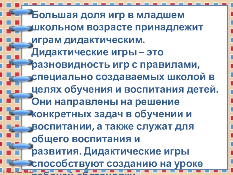 Слайд 8Большая доля игр в младшем школьном возрасте принадлежит играм дидактическим.