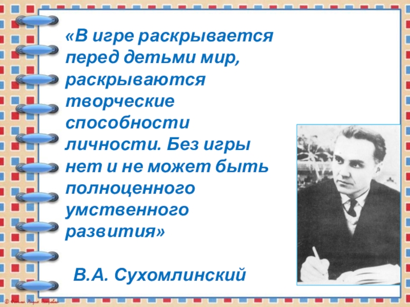 Слайд 2«В игре раскрывается перед детьми мир, раскрываются творческие способности личности. Без