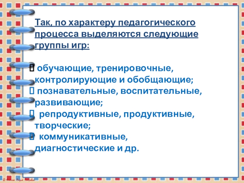Слайд 6Так, по характеру педагогического процесса выделяются следующие группы игр: