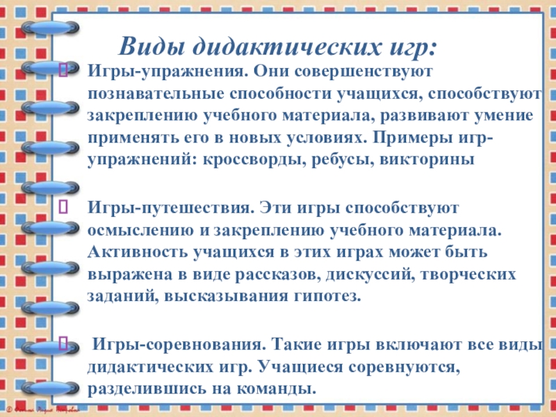 игры – это разновидность игр с правилами, специально создаваемых школой в целях обучения и воспитания детей. Они направлены на решение конкретных задач в обучении и воспитании, а также служат для общего воспитания и развития. Дидактические игры способствуют созданию на уроке рабочей обстановки.