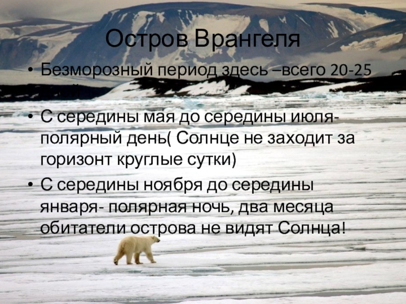 Остров ВрангеляБезморозный период здесь –всего 20-25 днейС середины мая до середины июля-полярный день( Солнце не заходит за