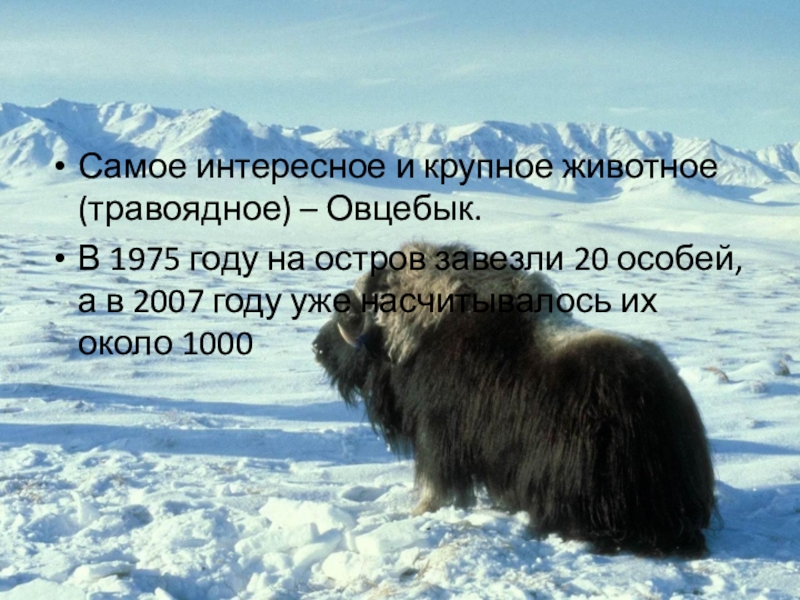 Самое интересное и крупное животное(травоядное) – Овцебык.В 1975 году на остров завезли 20 особей, а в 2007