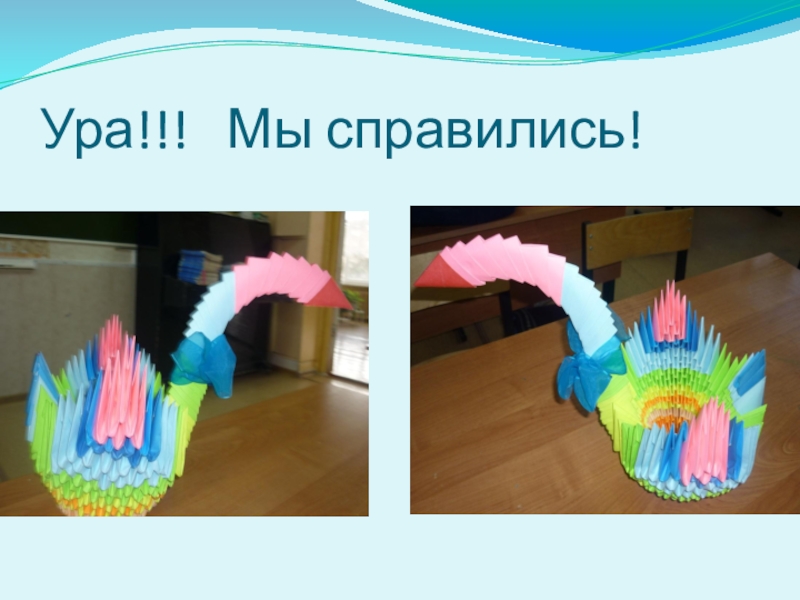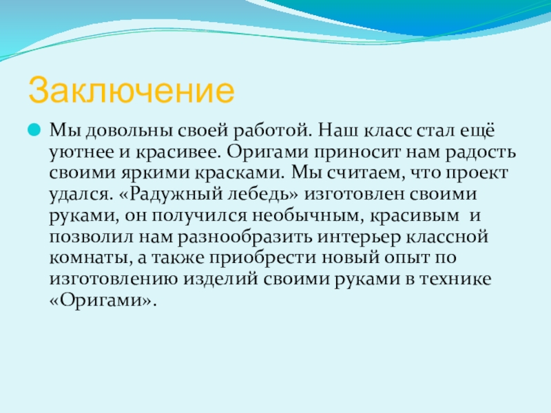 Оригами приносит нам радость своими яркими красками. Мы считаем, что проект удался. «Радужный лебедь» изготовлен своими руками, он получился необычным, красивым и позволил нам разнообразить интерьер классной комнаты, а также приобрести новый опыт по изготовлению изделий своими руками в технике «Оригами».