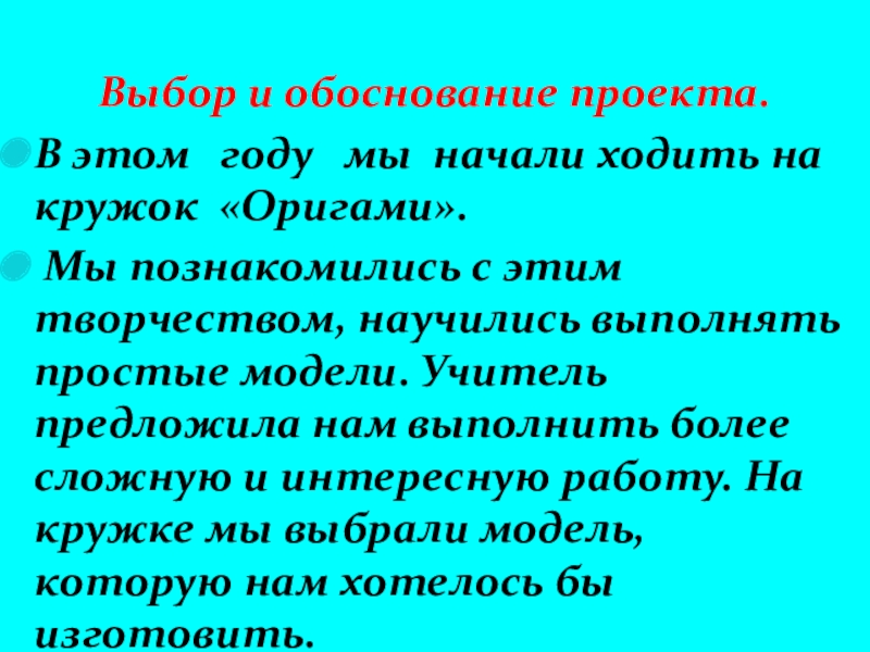 Мы познакомились с этим творчеством, научились выполнять простые модели. Учитель предложила нам выполнить более сложную и интересную работу. На кружке мы выбрали модель, которую нам хотелось бы изготовить.