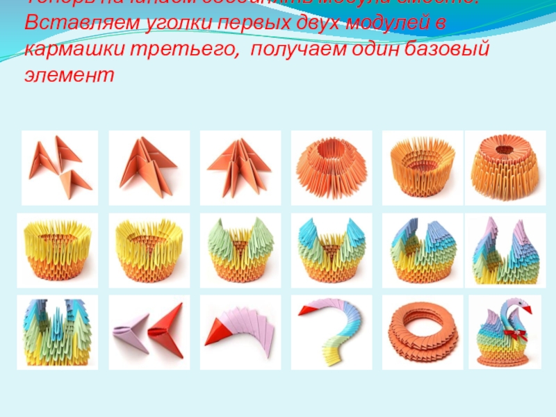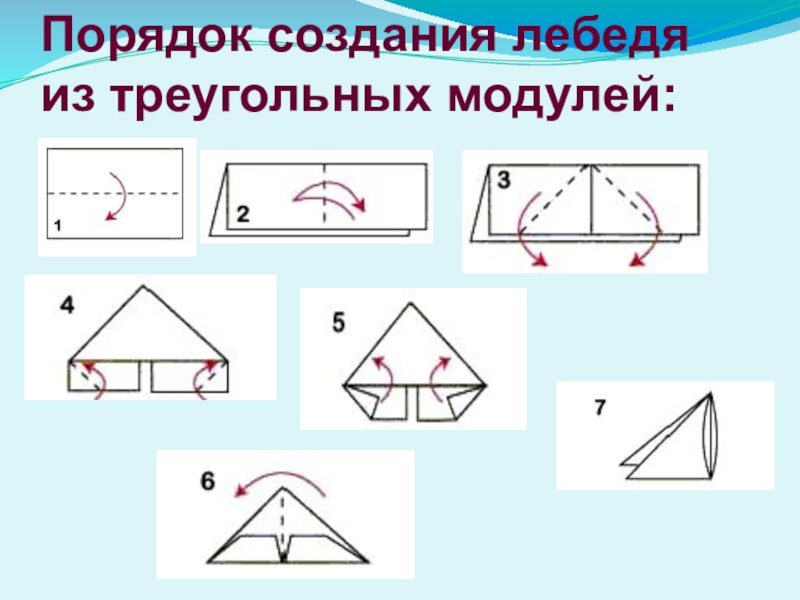 Слайд 8Порядок создания лебедя из треугольных модулей: