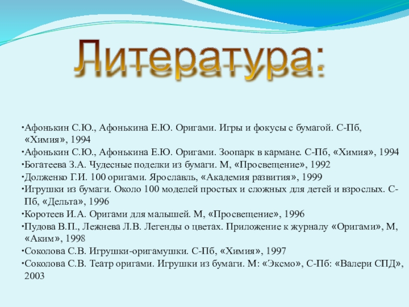 Соколова С.В. Театр оригами. Игрушки из бумаги. М: «Эксмо», С-Пб: «Валери СПД», 2003