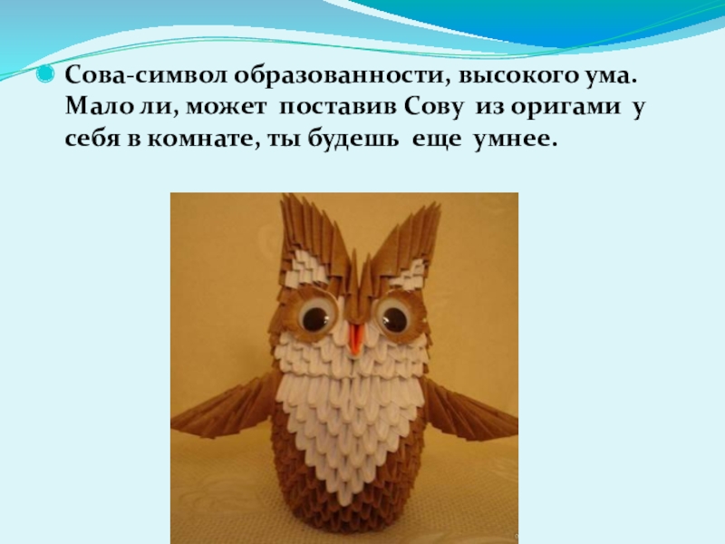 Сова-символ образованности, высокого ума. Мало ли, может поставив Сову из оригами