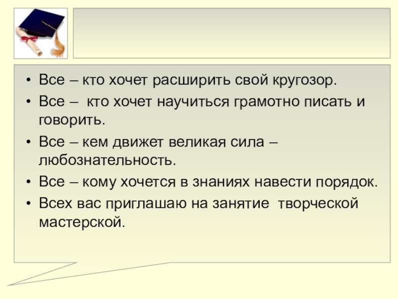 Это сайт презентаций, где можно хранить и обмениваться своими презентациями, докладами, проектами, шаблонами в формате PowerPoint с другими пользователями. Мы помогаем школьникам, студентам, учителям, преподавателям хранить и обмениваться учебными материалами.