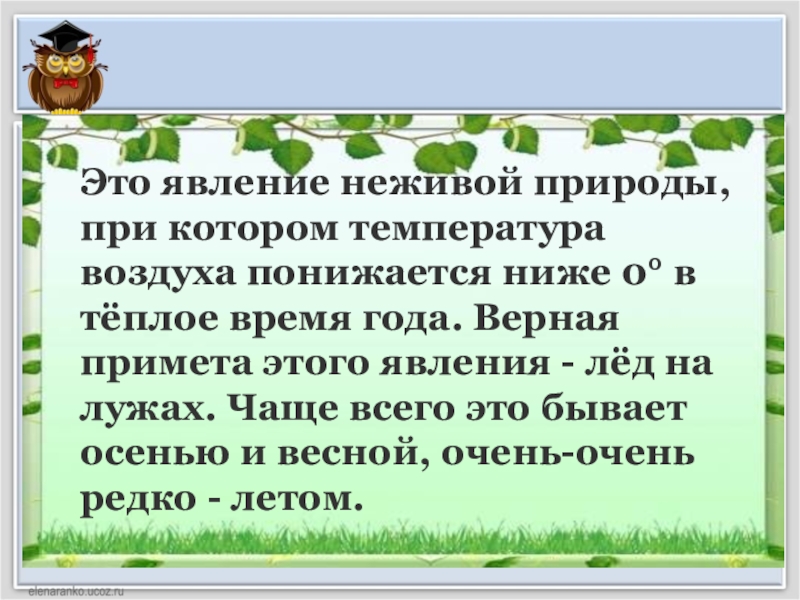 Это явление неживой природы, при котором температура воздуха понижается ниже 0° в тёплое время года. Верная примета этого явления - лёд на лужах. Чаще всего это бывает осенью и весной, очень-очень редко - летом.