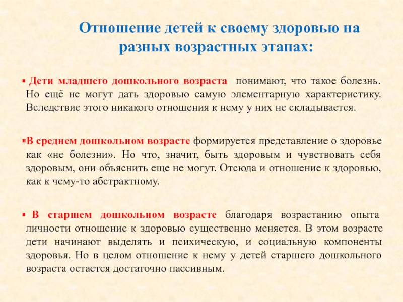 В старшем дошкольном возрасте благодаря возрастанию опыта личности отношение к здоровью существенно меняется. В этом возрасте дети начинают выделять и психическую, и социальную компоненты здоровья. Но в целом отношение к нему у детей старшего дошкольного возраста остается достаточно пассивным.