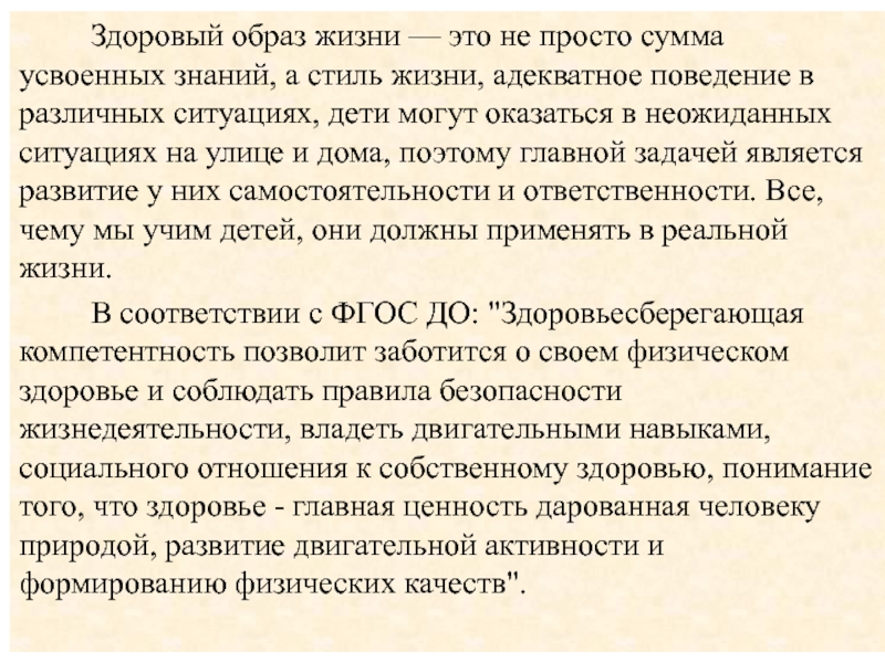 В соответствии с ФГОС ДО: "Здоровьесберегающая компетентность позволит заботится о своем физическом здоровье и соблюдать правила безопасности жизнедеятельности, владеть двигательными навыками, социального отношения к собственному здоровью, понимание того, что здоровье - главная ценность дарованная человеку природой, развитие двигательной активности и формированию физических качеств".