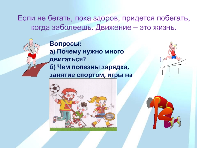 б) Чем полезны зарядка, занятие спортом, игры на свежем воздухе?