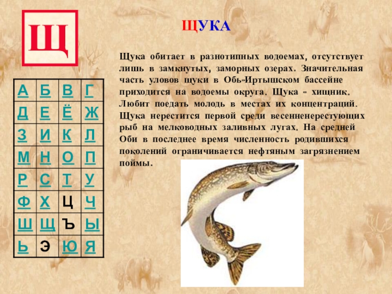 Значительная часть уловов щуки в Обь-Иртышском бассейне приходится на водоемы округа. Щука - хищник. Любит поедать молодь в местах их концентраций. Щука нерестится первой среди весенненерестующих рыб на мелководных заливных лугах. На средней Оби в последнее время численность родившихся поколений ограничивается нефтяным загрязнением поймы.