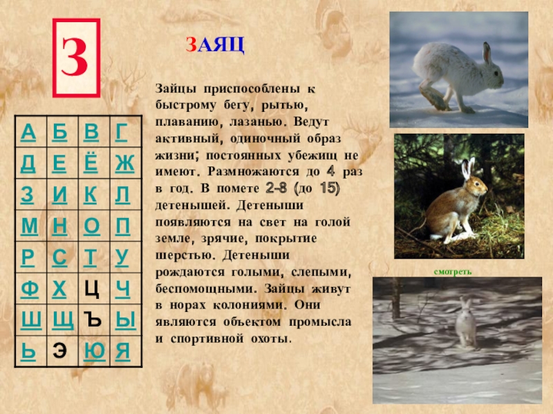 образ жизни; постоянных убежищ не имеют. Размножаются до 4 раз в год. В помете 2-8 (до 15) детенышей. Детеныши появляются на свет на голой земле, зрячие, покрытие шерстью. Детеныши рождаются голыми, слепыми, беспомощными. Зайцы живут в норах колониями. Они являются объектом промысла и спортивной охоты.