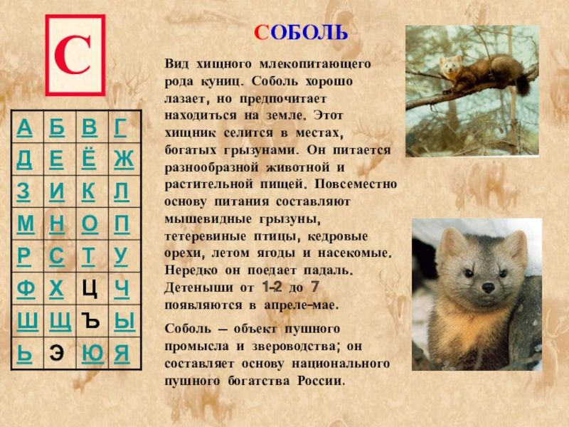 Вид хищного млекопитающего рода куниц. Соболь хорошо лазает, но предпочитает находиться