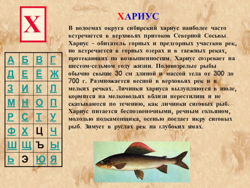 Северной Сосьвы. Хариус - обитатель горных и предгорных участков рек, но встречается в горных озерах и в таежных реках, протекающих по возвышенностям. Хариус созревает на шестом-седьмом году жизни. Половозрелые рыбы обычно свыше 30 см длиной и массой тела от 300 до 700 г. Размножается весной в верховьях рек и в мелких речках. Личинки хариуса вылупляются в июле, кормятся на мелководьях вблизи нерестилищ и не скатываются по течению, как личинки сиговых рыб. Хариус питается беспозвоночными, речным гольяном, молодью подкаменщика, осенью поедает икру сиговых рыб. Зимует в руслах рек на глубоких ямах.