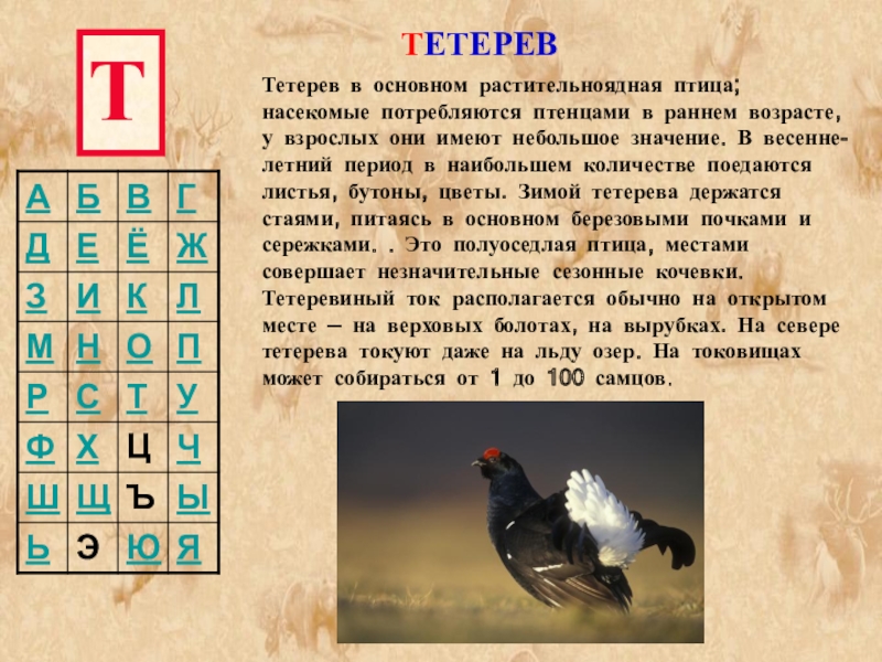 Тетерев в основном растительноядная птица; насекомые потребляются птенцами в раннем возрасте,