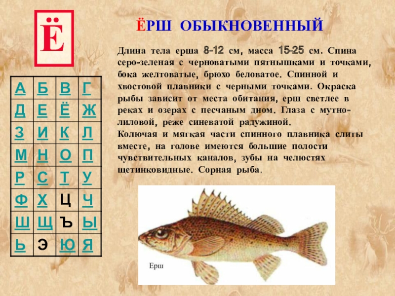 Длина тела ерша 8-12 см, масса 15–25 см. Спина серо-зеленая с