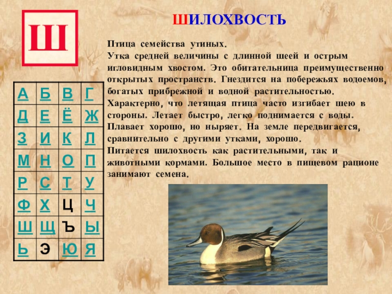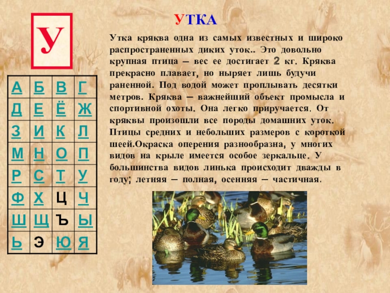 Это довольно крупная птица — вес ее достигает 2 кг. Кряква прекрасно плавает, но ныряет лишь будучи раненной. Под водой может проплывать десятки метров. Кряква — важнейший объект промысла и спортивной охоты. Она легко приручается. От кряквы произошли все породы домашних уток. Птицы средних и небольших размеров с короткой шеей.Окраска оперения разнообразна, у многих видов на крыле имеется особое зеркальце. У большинства видов линька происходит дважды в году; летняя — полная, осенняя — частичная.