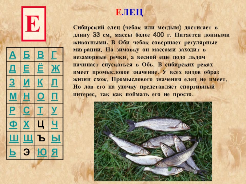 более 400 г. Питается донными животными. В Оби чебак совершает регулярные миграции. На зимовку он массами заходит в незаморные речки, а весной еще подо льдом начинает спускаться в Обь. В сибирских реках имеет промысловое значение. У всех видов образ жизни схож. Промыслового значения елец не имеет. Но лов его на удочку представляет спортивный интерес, так как поймать его не просто.