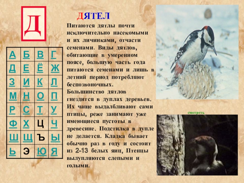 семенами. Виды дятлов, обитающие в умеренном поясе, большую часть года питаются семенами и лишь в летний период потребляют беспозвоночных.