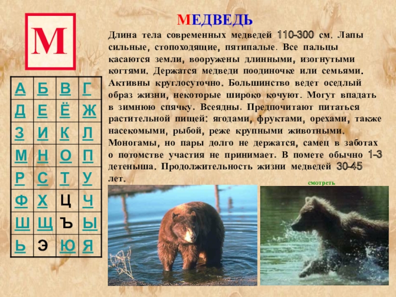Длина тела современных медведей 110–300 см. Лапы сильные, стопоходящие, пятипалые. Все
