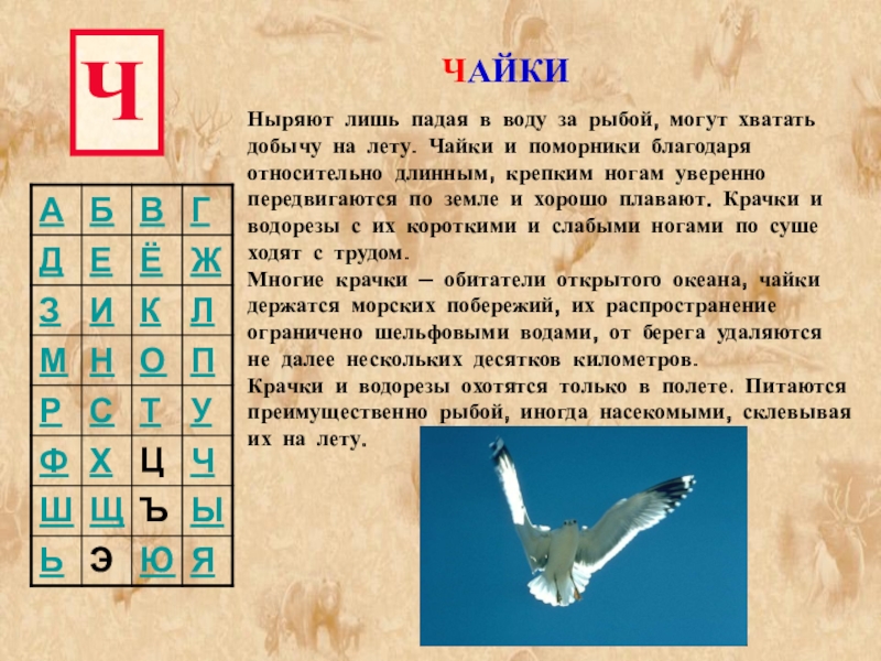 лету. Чайки и поморники благодаря относительно длинным, крепким ногам уверенно передвигаются по земле и хорошо плавают. Крачки и водорезы с их короткими и слабыми ногами по суше ходят с трудом.