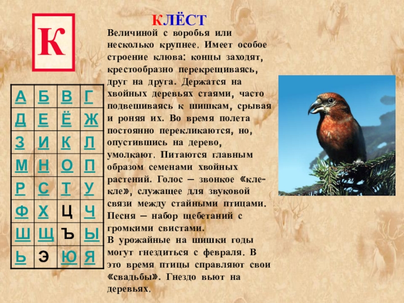 заходят, крестообразно перекрещиваясь, друг на друга. Держатся на хвойных деревьях стаями, часто подвешиваясь к шишкам, срывая и роняя их. Во время полета постоянно перекликаются, но, опустившись на дерево, умолкают. Питаются главным образом семенами хвойных растений. Голос — звонкое «кле-кле», служащее для звуковой связи между стайными птицами. Песня — набор щебетаний с громкими свистами.