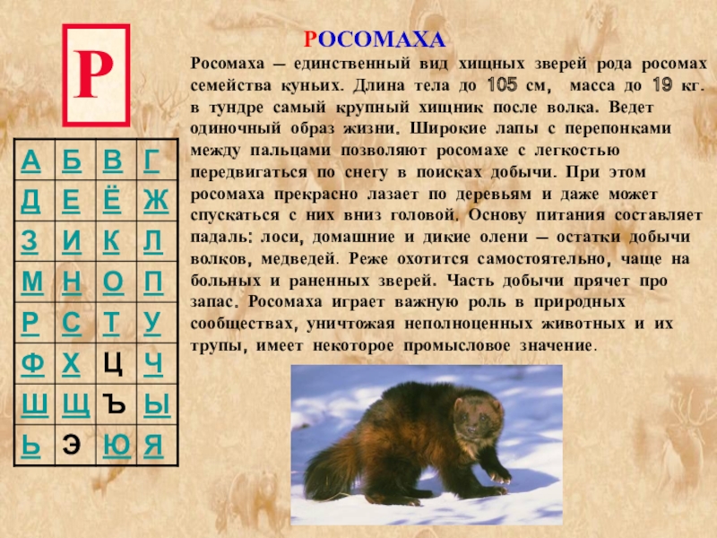 тела до 105 см, масса до 19 кг. в тундре самый крупный хищник после волка. Ведет одиночный образ жизни. Широкие лапы с перепонками между пальцами позволяют росомахе с легкостью передвигаться по снегу в поисках добычи. При этом росомаха прекрасно лазает по деревьям и даже может спускаться с них вниз головой. Основу питания составляет падаль: лоси, домашние и дикие олени — остатки добычи волков, медведей. Реже охотится самостоятельно, чаще на больных и раненных зверей. Часть добычи прячет про запас. Росомаха играет важную роль в природных сообществах, уничтожая неполноценных животных и их трупы, имеет некоторое промысловое значение.