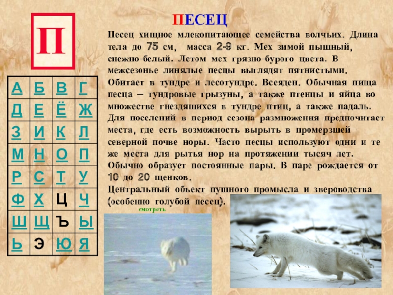 Песец хищное млекопитающее семейства волчьих. Длина тела до 75 см, масса