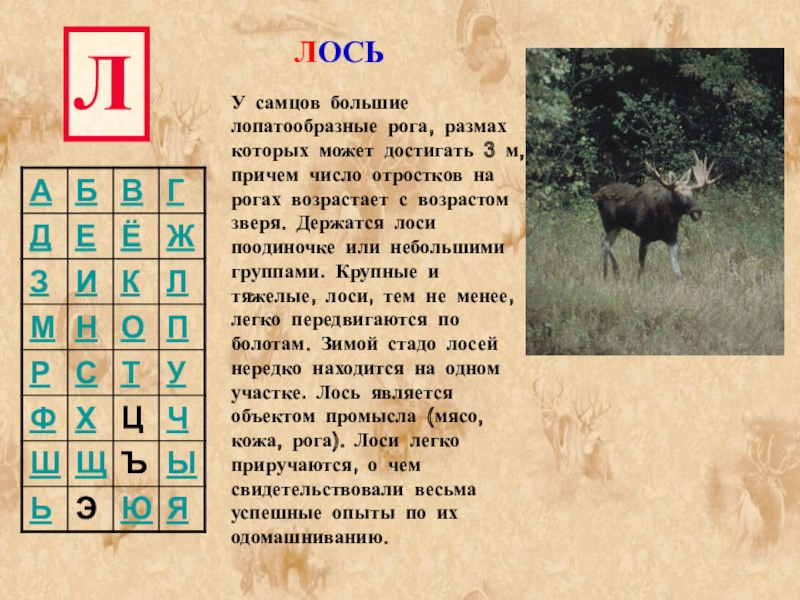 причем число отростков на рогах возрастает с возрастом зверя. Держатся лоси поодиночке или небольшими группами. Крупные и тяжелые, лоси, тем не менее, легко передвигаются по болотам. Зимой стадо лосей нередко находится на одном участке. Лось является объектом промысла (мясо, кожа, рога). Лоси легко приручаются, о чем свидетельствовали весьма успешные опыты по их одомашниванию.