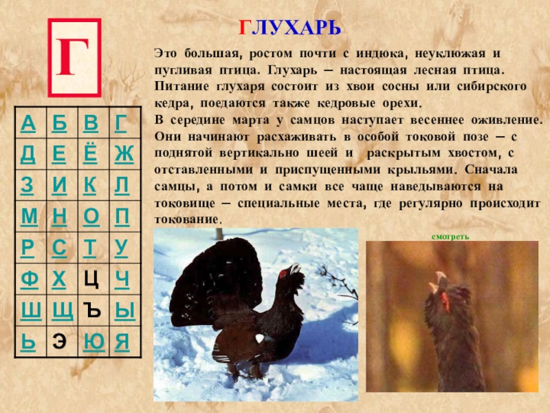 Это большая, ростом почти с индюка, неуклюжая и пугливая птица. Глухарь