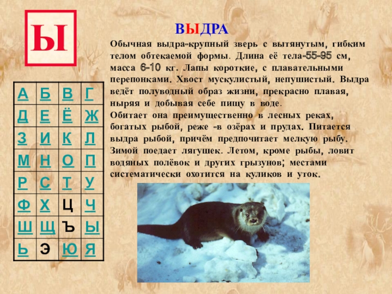 Обычная выдра-крупный зверь с вытянутым, гибким телом обтекаемой формы. Длина её
