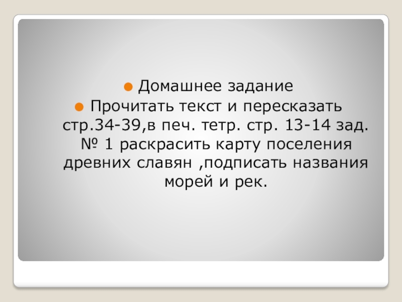Домашнее заданиеПрочитать текст и пересказать стр.34-39,в печ. тетр. стр. 13-14 зад. № 1 раскрасить карту поселения древних