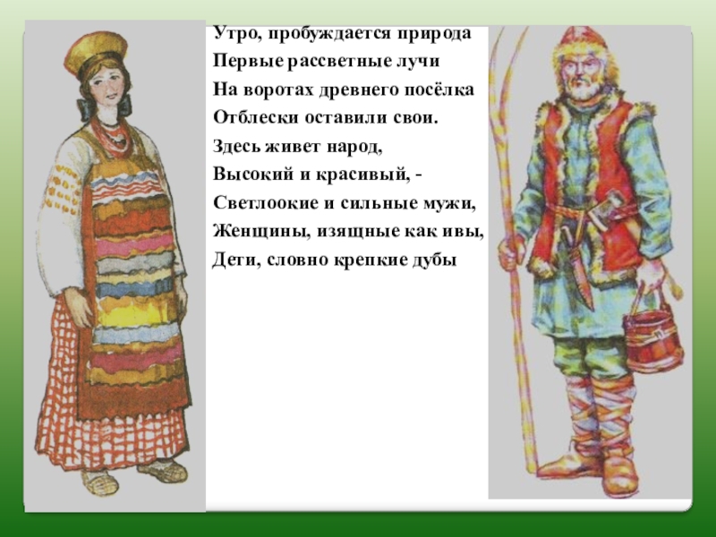 Слайд 5Утро, пробуждается природа Первые рассветные лучи На воротах древнего посёлка Отблески оставили свои. Здесь живет