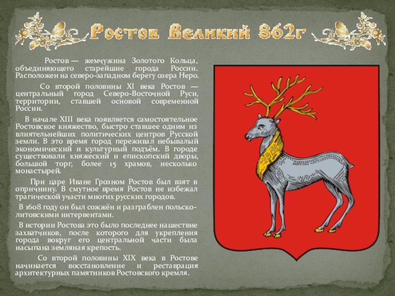 Со второй половины XI века Ростов — центральный город Северо-Восточной Руси, территории, ставшей основой современной России.