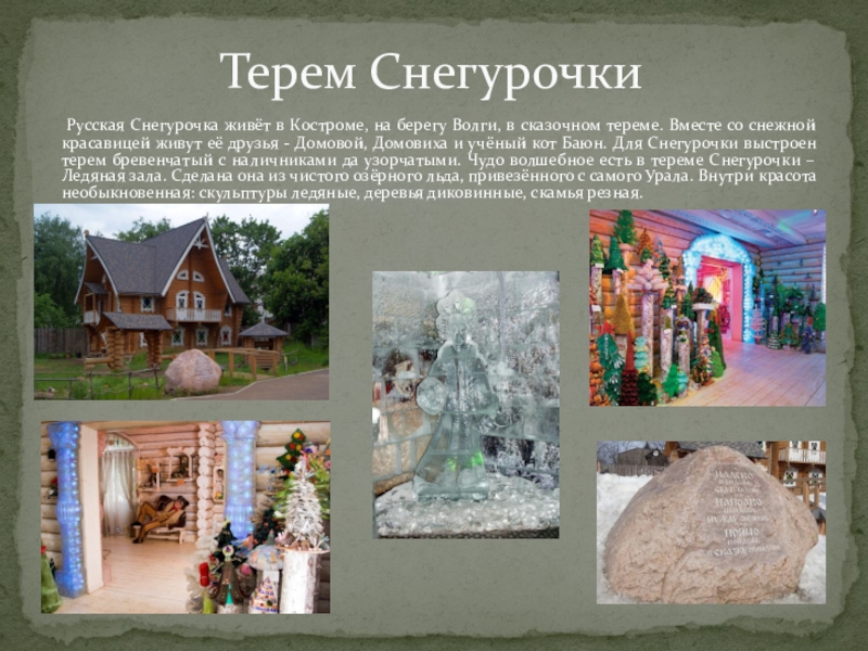 в сказочном тереме. Вместе со снежной красавицей живут её друзья - Домовой, Домовиха и учёный кот Баюн. Для Снегурочки выстроен терем бревенчатый с наличниками да узорчатыми. Чудо волшебное есть в тереме Снегурочки – Ледяная зала. Сделана она из чистого озёрного льда, привезённого с самого Урала. Внутри красота необыкновенная: скульптуры ледяные, деревья диковинные, скамья резная.
