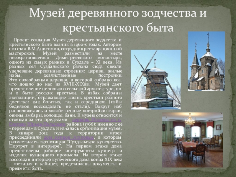 деревянного зодчества и крестьянского быта возник в 1960-х годах. Автором его стал В.М.Анисимов, сотрудник реставрационной мастерской. Музей разместили на месте несохранившегося Димитриевского монастыря, одного из самых ранних в Суздале – XI века. Из разных сел Суздальского района сюда свезли уцелевшие деревянные строения: церкви, жилые избы, хозяйственные постройки.